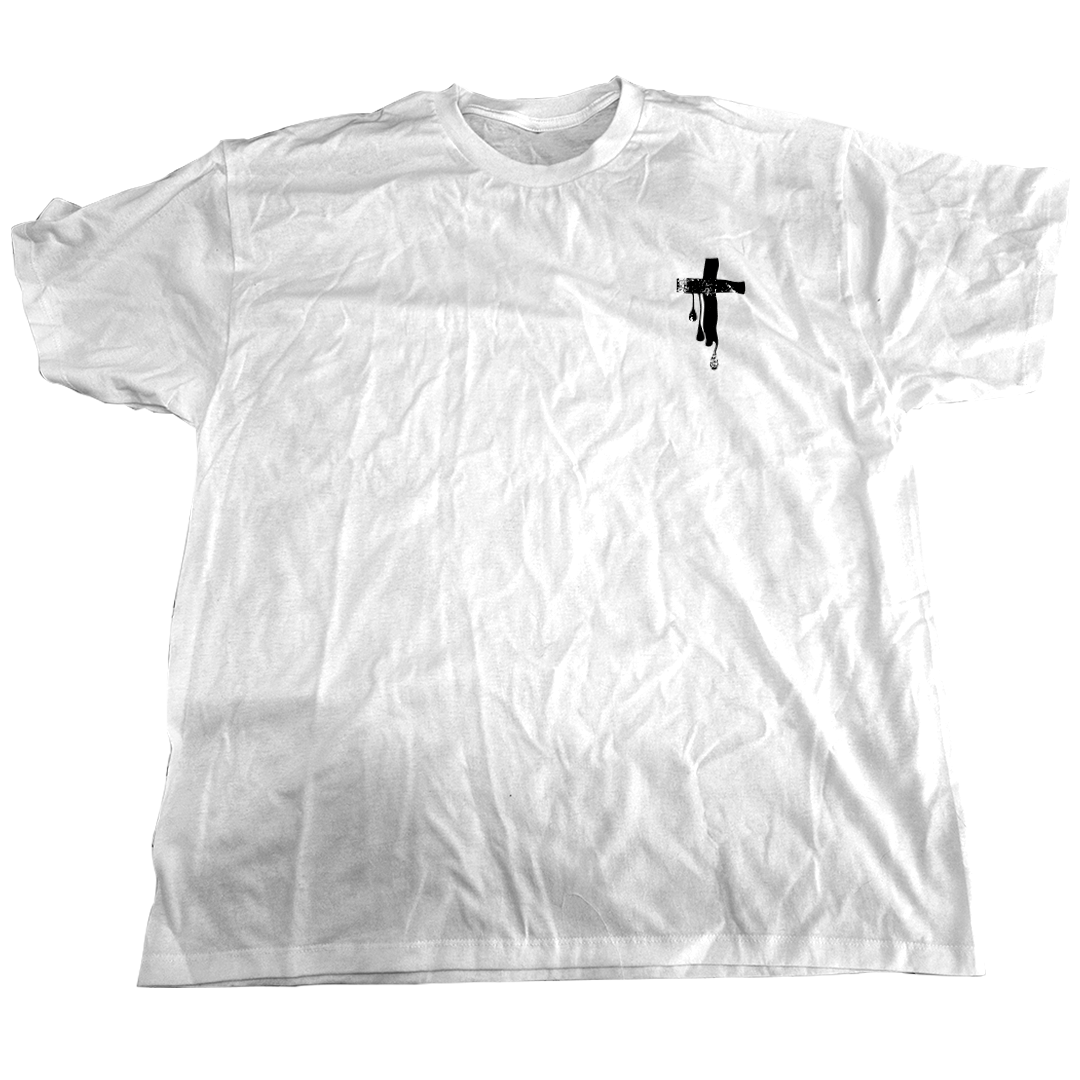 Camiseta con jesucrsito en la espalda, padre nuestro en latin y "perdona nuestros pecados" en la parte superior.